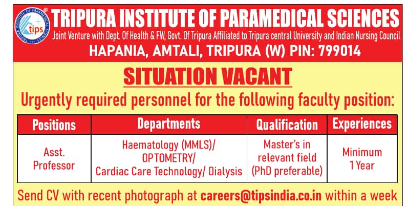 Faculty Recruitment 2025 Job vacancy notification announced by Tripura Institute of Paramedical Sciences, Tripura – Assistant Professor Jobs for the 2025-2026 academic year. Eligible candidates may apply through Email