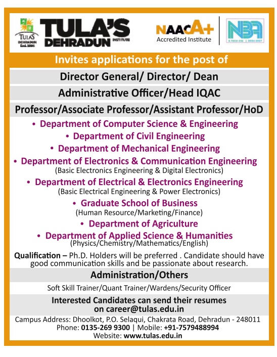 Teaching and Non-Teaching Jobs vacancy notification announced by Tula’s Institute, Dehradun for the post of Director/ Dean/ Administrative Officer/ Head IQAC, Professors/ Associate Professors/ Assistant Professors, HoD, Soft Skill Trainer, Quant Trainer, Warden, Security Officer for the 2024-2025 academic calendar year. Eligible candidates may apply through Email.