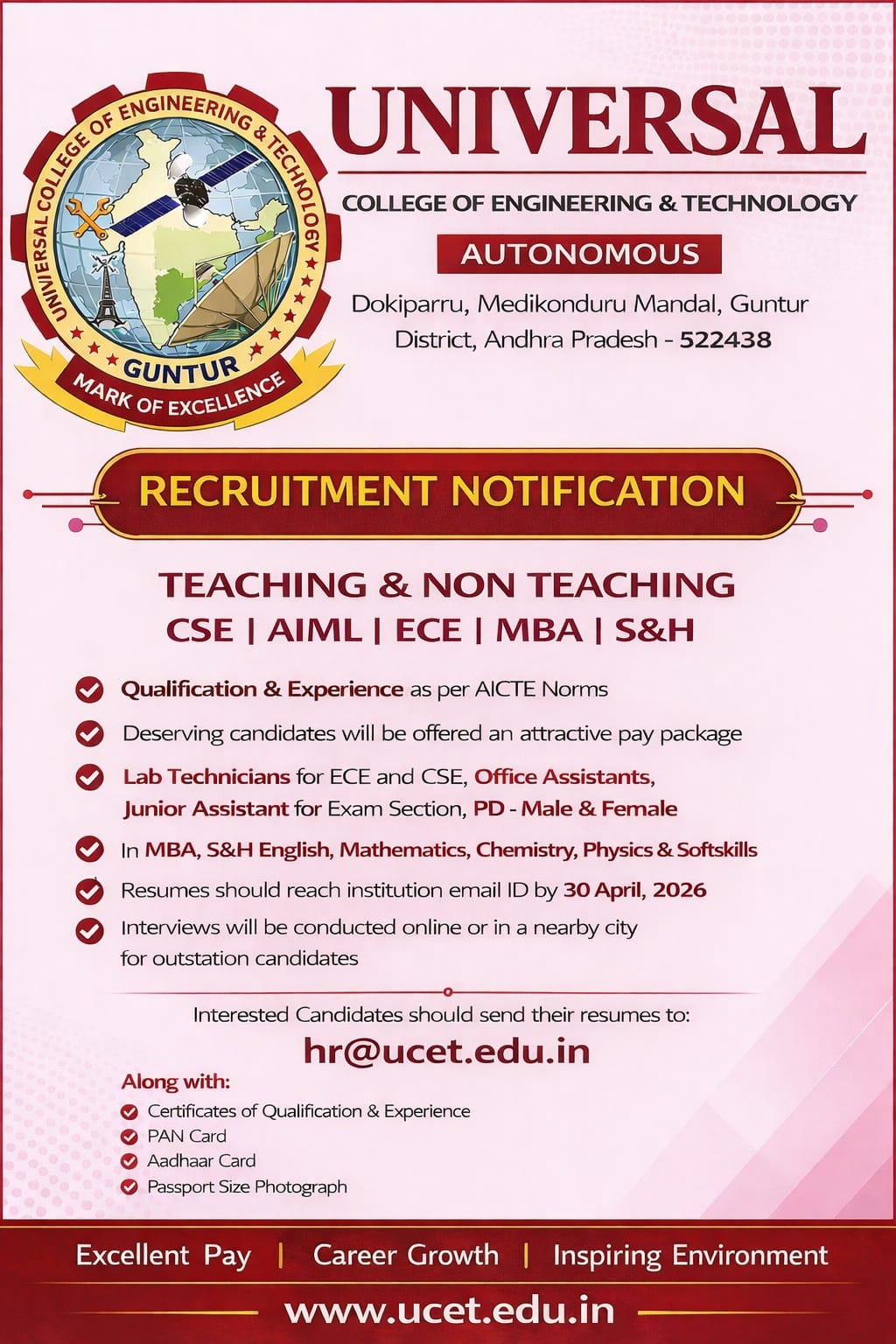 Universal College of Engineering & Technology (Autonomous), Guntur, Andhra Pradesh, has announced faculty and non-teaching recruitment for the academic year 2026. Applications are invited for Professor, Associate Professor, Assistant Professor, Physical Director, Additional Controller of Examinations, and multiple administrative positions. The institution is seeking qualified professionals with strong academic credentials, leadership ability, and commitment to quality education. This is an excellent opportunity to join a NAAC B++ accredited autonomous college known for academic excellence and serene campus infrastructure. Eligible candidates are encouraged to apply through email before the deadline.