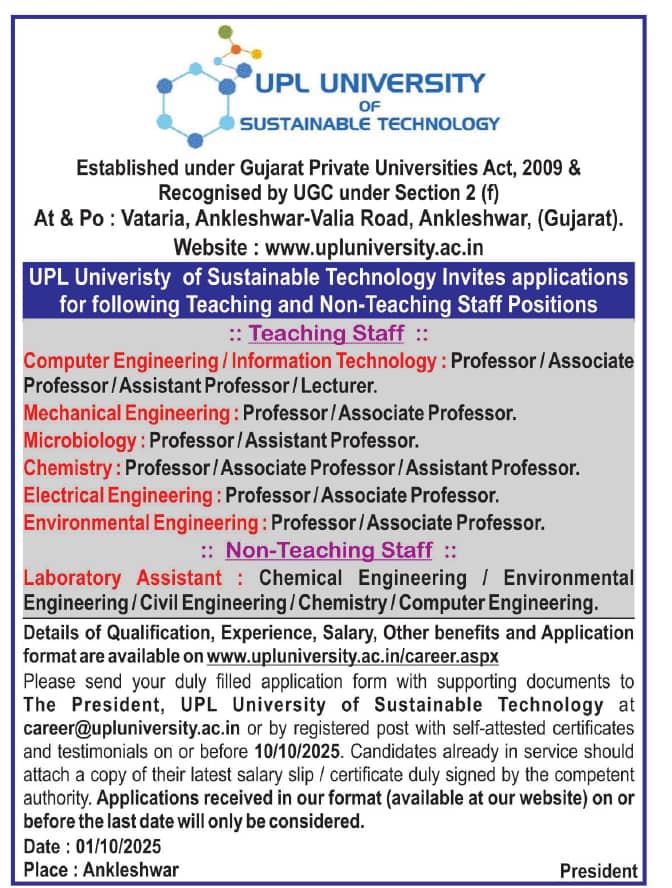 Teaching and Non-Teaching Jobs vacancy notification announced by UPL University of Sustainable Technology, Gujarat for the post of Professor, Associate Professor & Assistant Professor, Lecturer jobs. Eligible candidates may apply through Email/ Postal