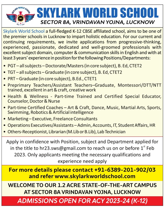 Faculty recruitment 2023 jobs notification announced by various Colleges and Schools in Uttar Pradesh in today’s (18/01/2023) newspapers.