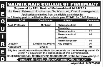 Hiring Organization: Valmik Naik College Of Pharmacy