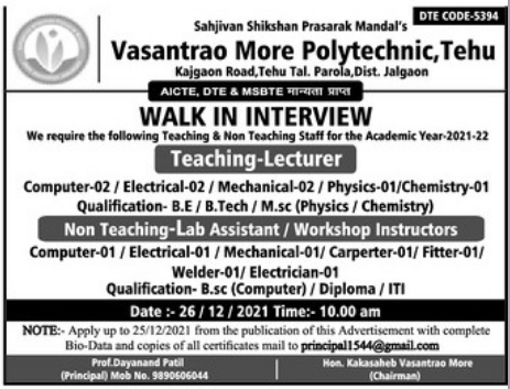 Vasantrao More Polytechnic, Tehu, Maharashtra invites a job application form for the post of lecturer in various departments and Lab Assistant, Workshop Instructor. For more details read the full post.