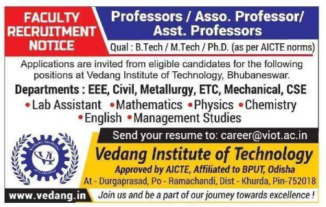 Hiring Organization: Vedang Institute of Technology, Khurda