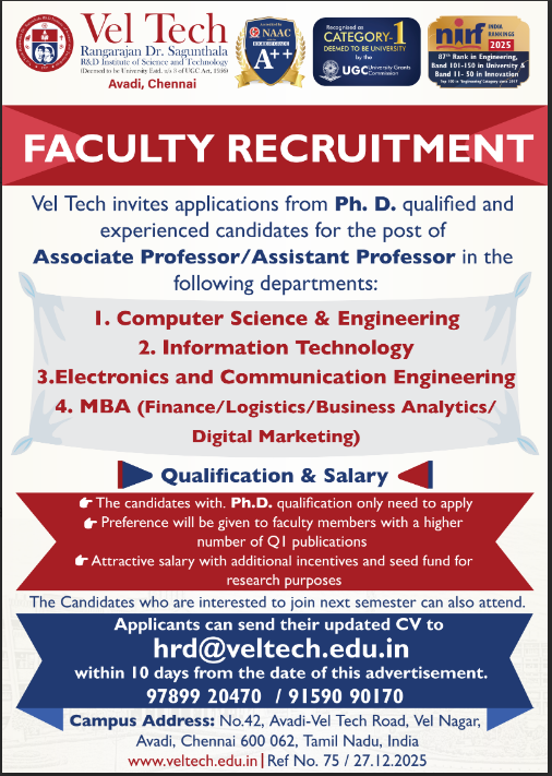 Faculty recruitment Job vacancy notification announced by Vel Tech Rangarajan Dr. Sakunthala R&D Institute of Science and Technology Chennai, Tamil Nadu for the academic year 2025-2026. Eligible candidates may apply through Email.