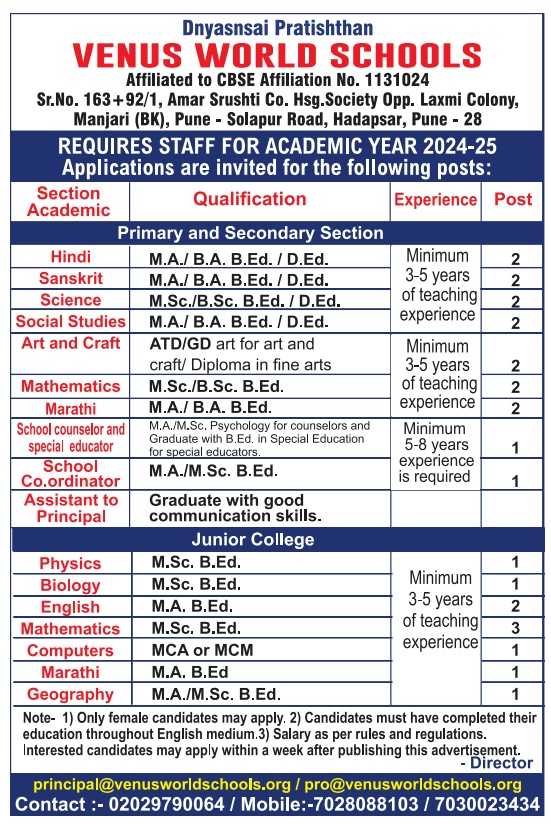 Faculty Recruitment 2023 notification announced by Venus World Schools, Pune – Teachers, School Counsellor, Special educator, Assistant to Principal Jobs. Eligible candidates may apply by email and attend walk-in interviews on 23rd, 24th & 25th December 2023.