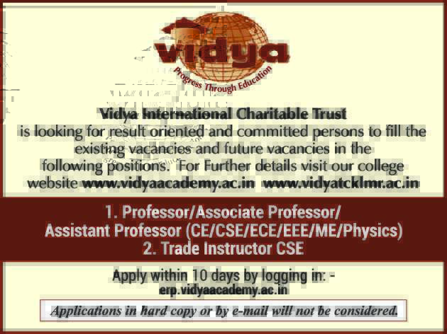 Faculty Recruitment job notification announced by Vidya International Charitable Trust, Thrissur, Kerala for the post of Professor, Associate Professor, Assistant Professor Jobs. Eligible candidates may apply by Online.