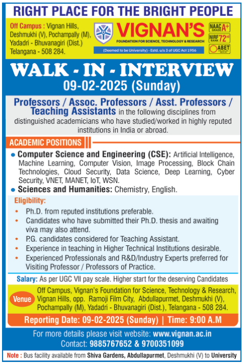 Faculty Recruitment job notification announced by Vignan’s Foundation for Science, Technology and Research Off Campus for Professor, Assistant Professor, Associate Professor Jobs. Eligible candidates may Walk-In