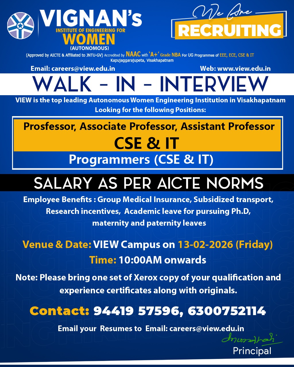 Faculty Recruitment 2026 job notification announced by VIGNAN’S Institute of Engineering for Women, Visakhapatnam, Andhra Pradesh for 2026-27 academic year. Eligible candidates may attend Walk-in interview.