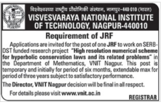 Faculty Recruitment job notification announced by Visvesvaraya National Institute of Technology, Nagpur for the post of Junior Research Fellow. Eligible candidates may apply through email.