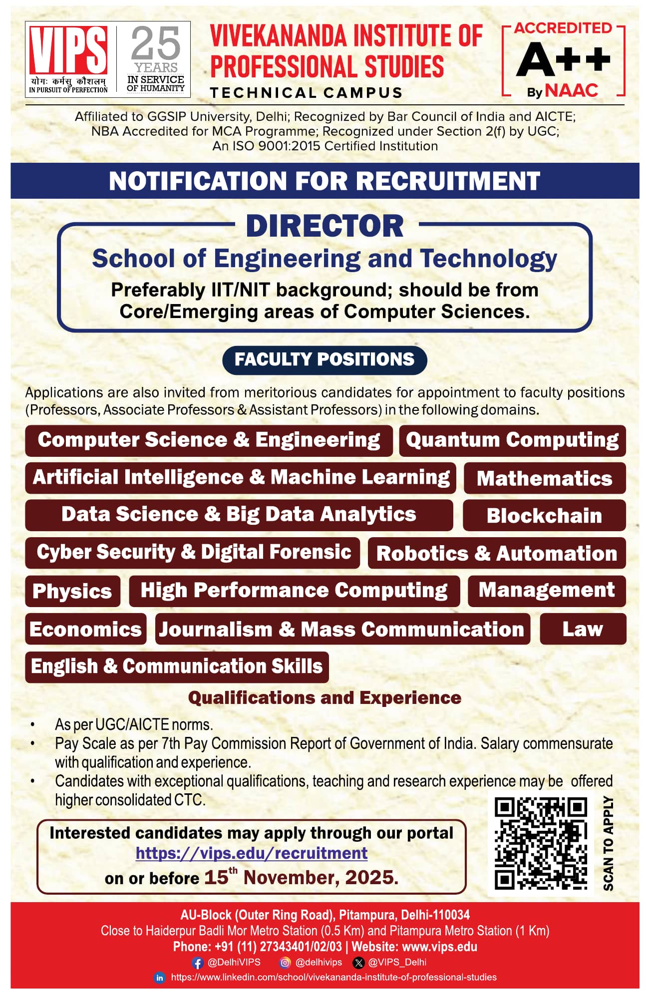 Teaching and Non-Teaching Jobs vacancy notification announced by Vivekananda Institute of Professional Studies, Delhi for the 2025-2026 academic year. Eligible candidates may apply through Online