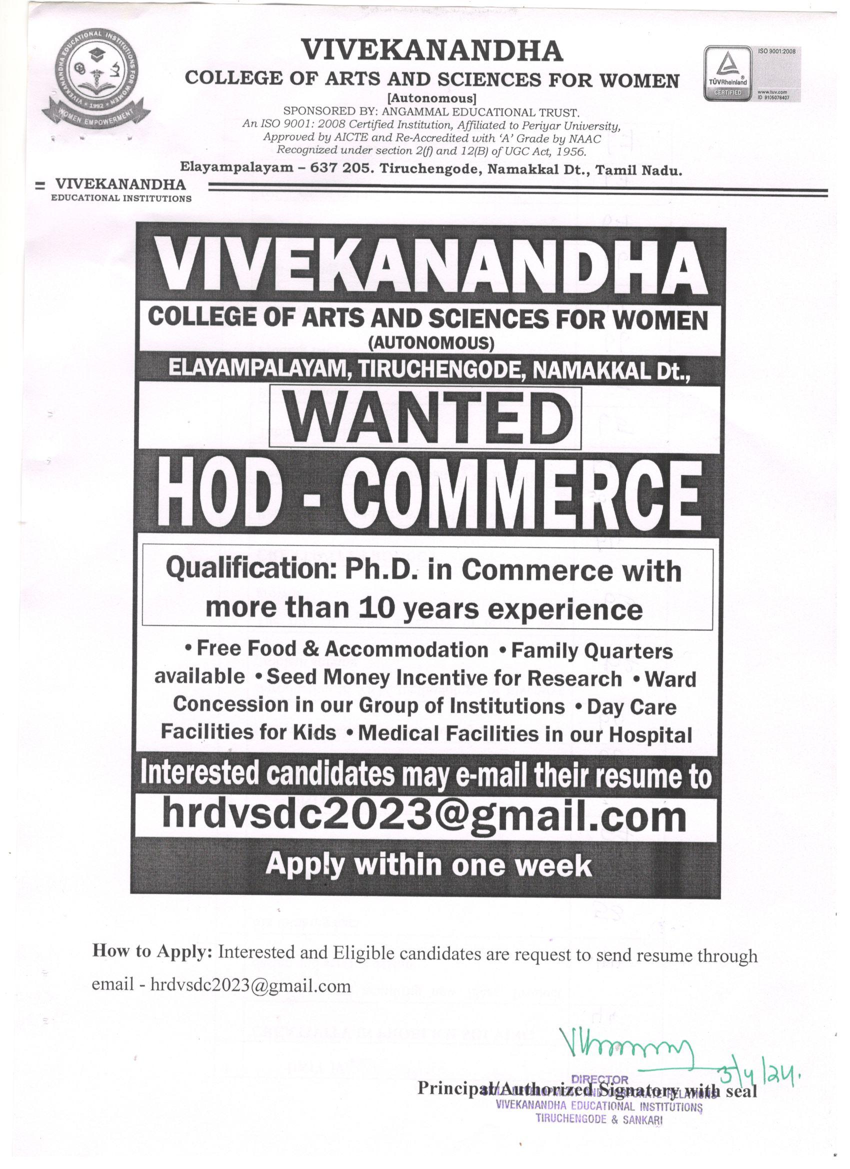 HOD Recruitment 2024 Job Notification announced by Vivekanandha College of Arts and Sciences for women (Autonomous) in Tiruchengode, Namakkal – Dt Tamilnadu, for 2024-2025 academic year. Eligible candidates are requested to apply through email.