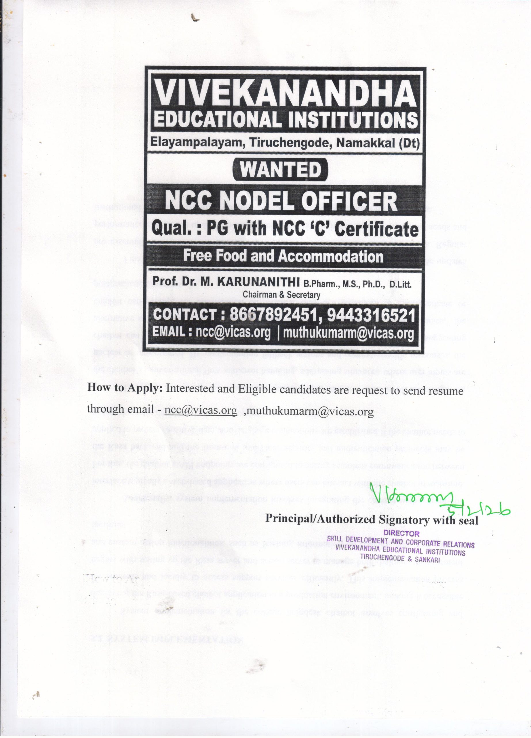 Essential Qualification: PG with NCC ‘C’ Certificate