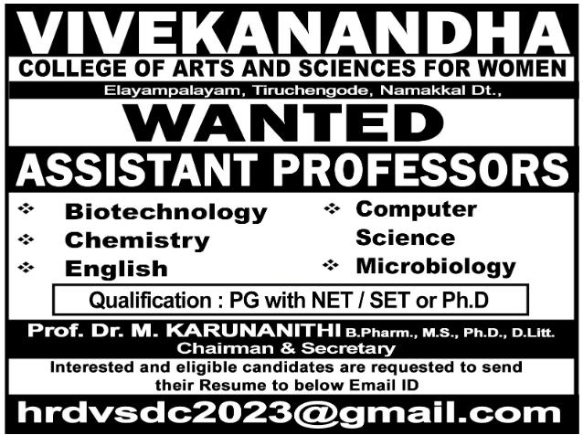 Faculty Recruitment 2025 Job Notification announced by Vivekanandha College of Arts and Sciences for women (Autonomous) in Tiruchengode, Namakkal – Dt Tamilnadu, for 2025-2026 academic year. Eligible candidates are requested to apply through email.